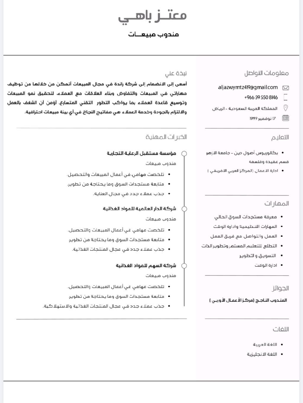 مندوب مبيعات ابحث عن عمل في الرياض خبرة في المواد الغذائية شركة الدار العالميه للمواد الغذائية في مصر وشركة مؤسسة الرعاية لمستحضرات التجميل السعودية السن 25 سنة أقامه سارية رخصة قيادة