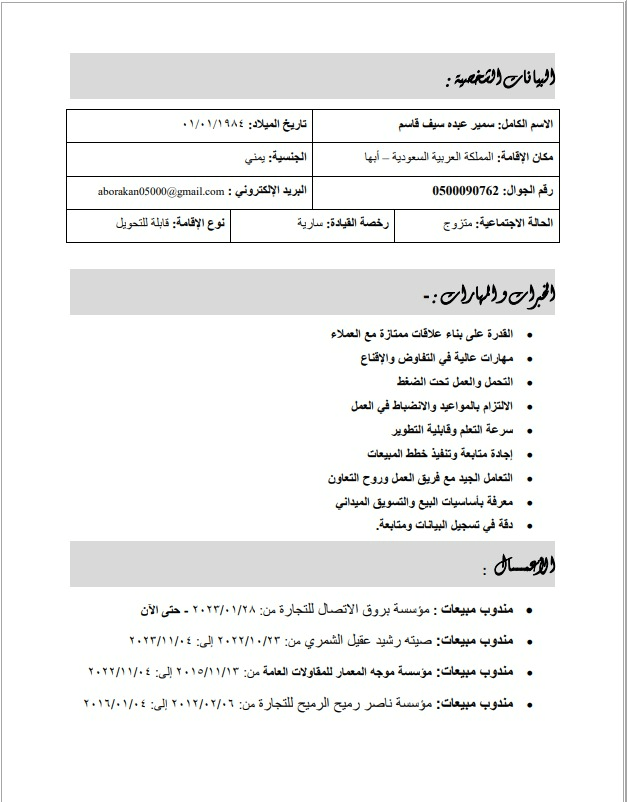 مندوب مبيعات وتسويق خبرة يبحث عن عمل متواجد بالمنطقة الجنوبية في مدينة أبها ويرغب العمل باي منطقة أخرى للتواصل