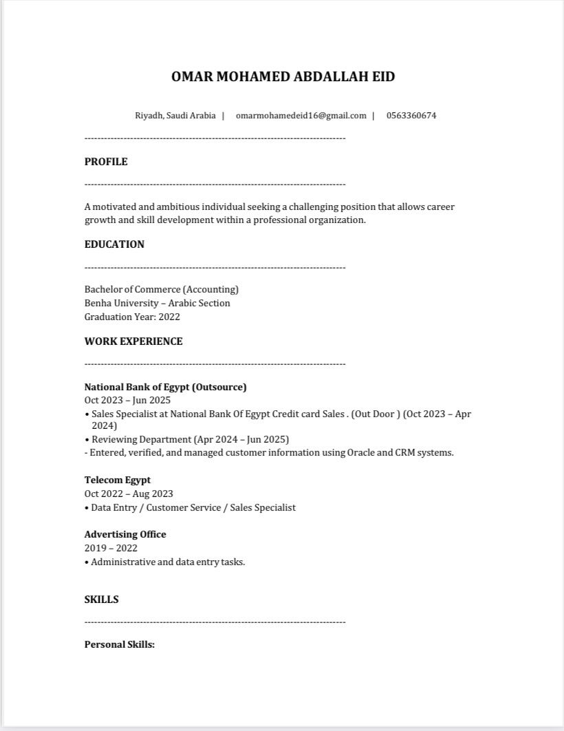 مندوب مبيعات وتسويق مصري الجنسية، خبرة عالية في المجال المصرفي، خبرة بمجال خدمة العملاء والمبيعات مع العملاء VIP البلاتينم مهارات عالية للتواصل أجيد استخدام برامج الأوفيس بشكل محترف، OutLook, CRM, Computer Skills، يمكن العمل بأي مكان بالمملكة، مقيم في الرياض، إقامة سارية قابلة للنقل