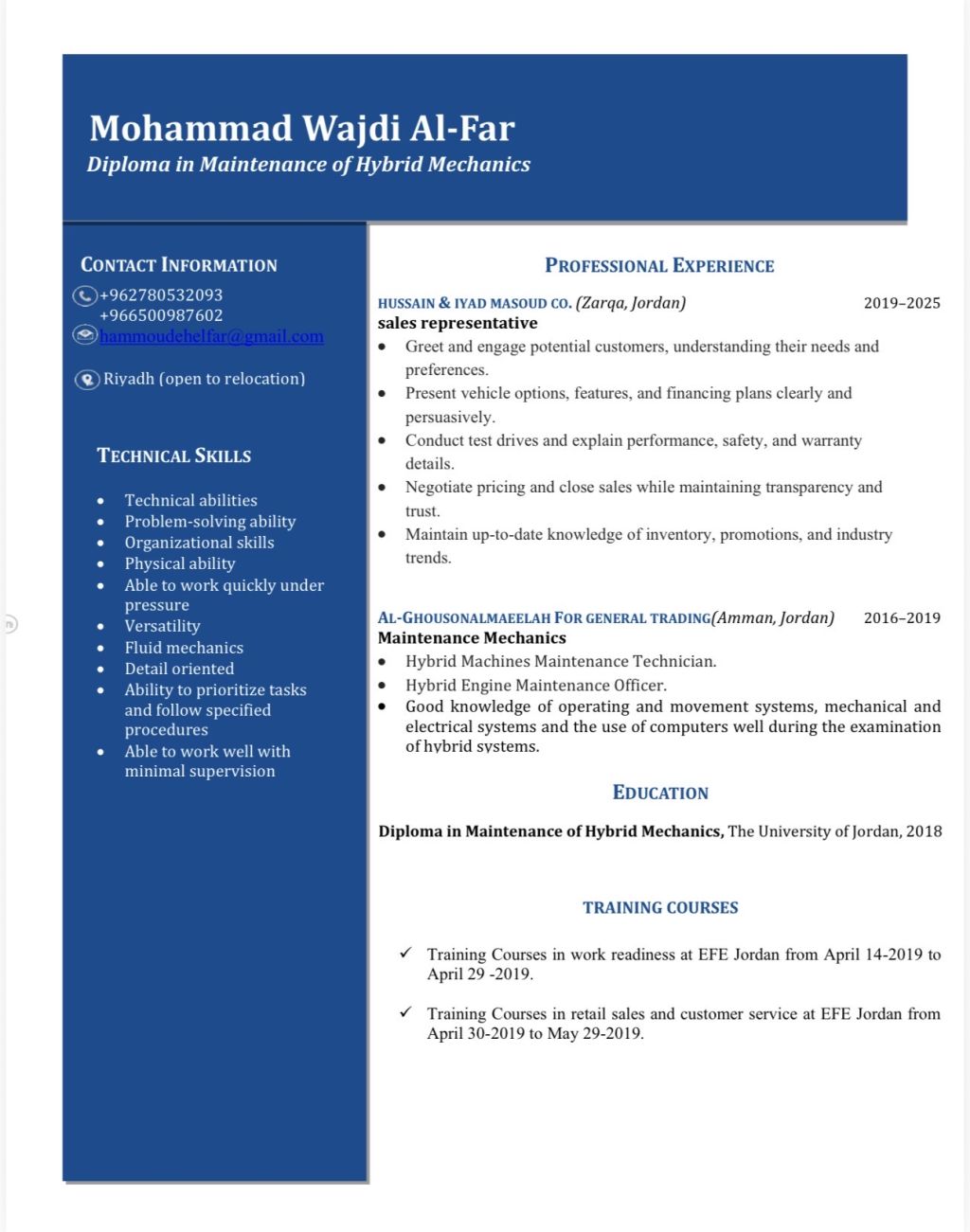 خبرة خمس سنوات في مبيعات السيارات بالاضافة الى دورات