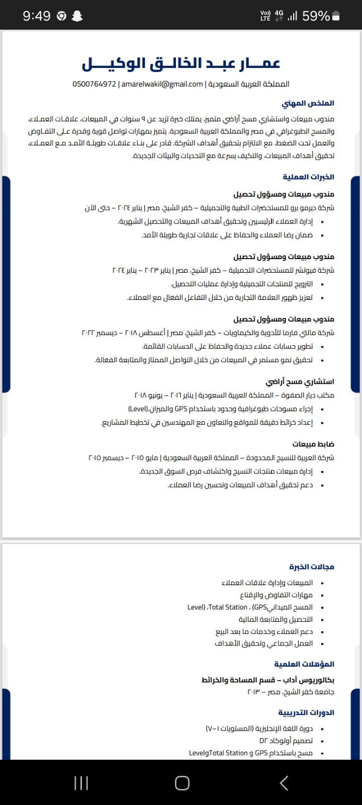 مندوب مبيعات وتحصيل مصري الجنسية أقيم في الرياض حاليا أقامه سارية / خبرة في مجال مبيعات الادوية ومستحضرات التجميل 5 سنوات وخبرة 1 سنة مشرف مبيعات وأيضا خبرة 4 سنوات في الدمام وجدة