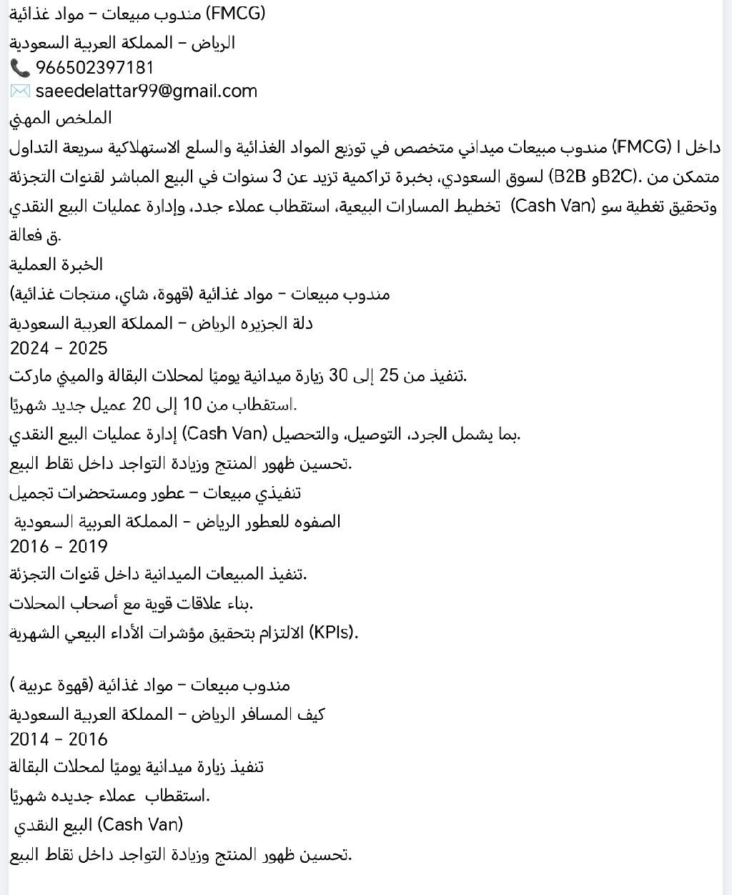 مندوب مبيعات بخبرة متنوعة في مجالات مختلفة من المبيعات، إدارة العملاء، وتطوير الأعمال. اسعي دائما في تحقيق أهداف النمو وخلق فرص جديدة للشركة. متاح للعمل فورا وأسعى لفرصة مناسبة لتقديم خبرتي وتحقيق نتائج ملموسة. مهارات رئيسية زيادة المبيعات وتحقيق الأهداف المرسومة. إدارة علاقات العملاء وتحسين رضاهم. اكتشاف فرص جديدة وتحويلها الى صفقات ناجحة. الالتزام بالمواعيد والعمل بكفاءة عالية