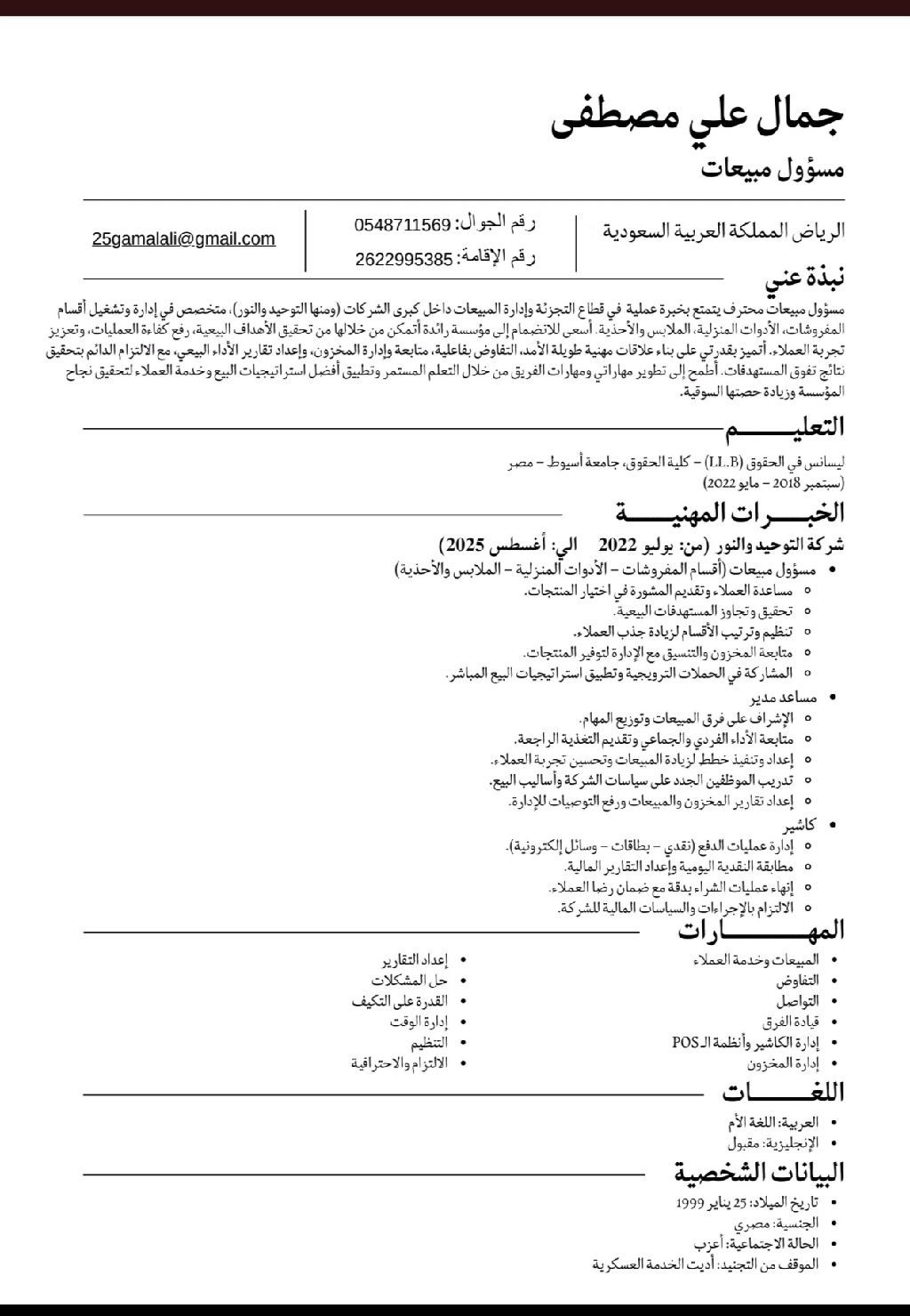 مسؤول مبيعات محترف حاصل ع ليسانس حقوق أتمتع بخبرة عالية في قطاع التجزئة وادارة المبيعات متابعه اعداد تقارير المخازن والتنسيق مع الادارة لتوفير المنتجات مساعده العملاء وتقديم المشورة في اختيار المنتجات المشاركة في الحملات الترويجية وتطبيق استراتيجيات البيع المباشر الاشراف ع فرق المبيعات وتوزيع المهام اعداد وتنفيذ خطط لزيادة المبيعات وتحسين تجربة العملاء تدريب الموظفين الجدد ع سياسات وأساليب الشركة