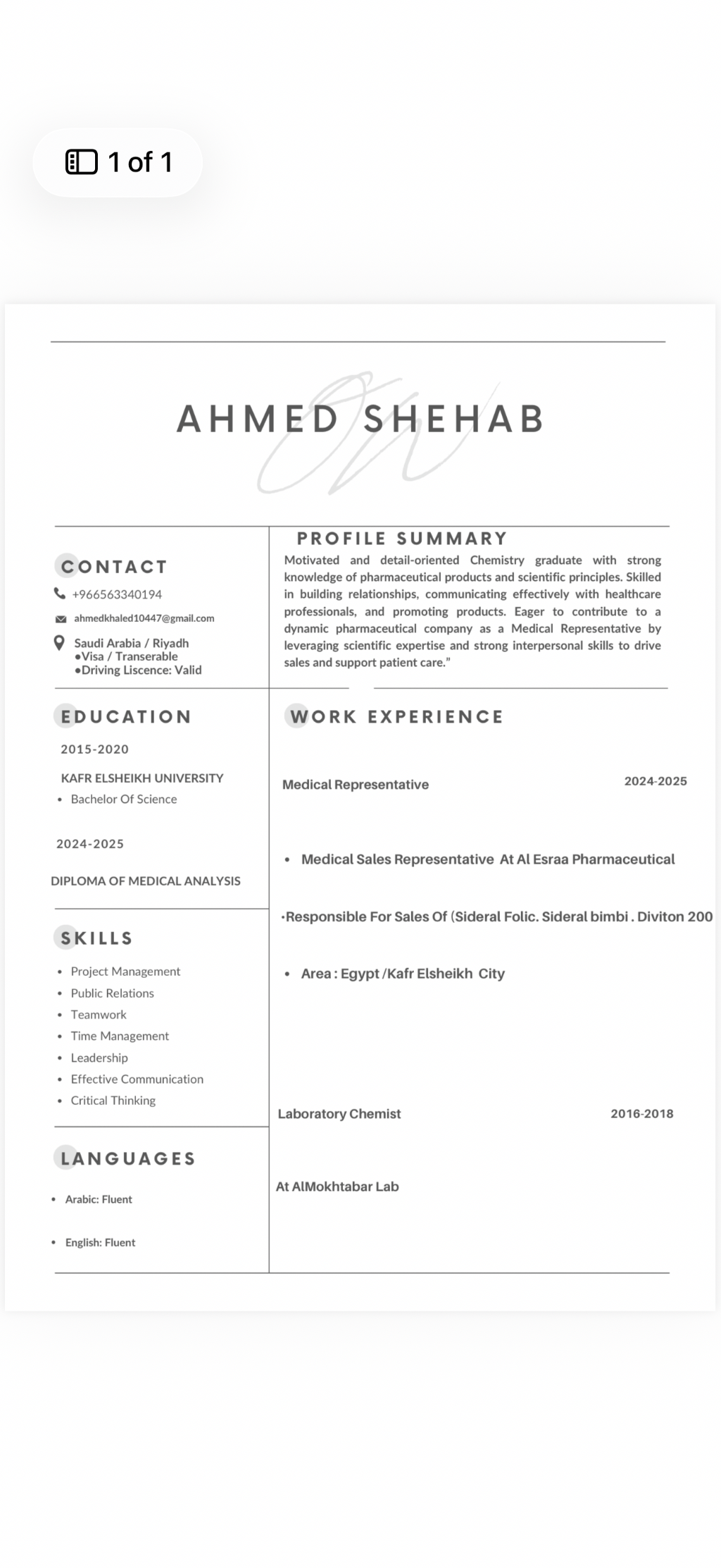 مندوب دعاية طبية حاصل على بكالوريوس علوم (كيمياء) امتلك خبرة عملية في مجال المبيعات الطبية والدعاية للادوية والمكملات الغذائية، وأسعى للانضمام الى شركة محترمة توفر بيئة عمل احترافية وفرص تطوير حقيقية. الخبرات العمل كمندوب دعاية طبية بشركة ادوية - الترويج للمنتجات الدوائية والمكملات الغذائية - التعامل المباشر مع الأطباء والصيدليات - تحقيق الأهداف البيعية وبناء علاقات قوية مع العملاء - خبرة سابقة