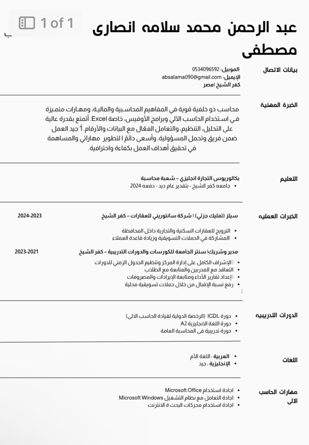 محاسب مصري خريج تجارة انجلش 2024 له خبرة في السعودية بشركة مقاولات وخبرة في مجال التسويق إقامة سارية ورخصة قيادة