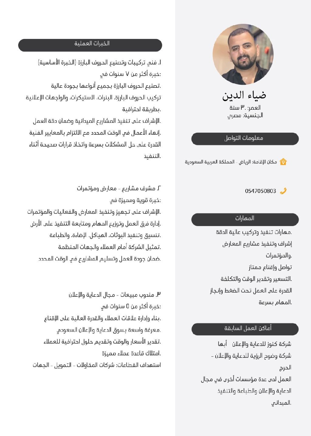 ضياء الدين، 30 عاما، مصري مقيم في الرياض. خبرة أكثر من 7 سنوات فني تصنيع وتركيب الحروف البارزة وجميع أعمال الدعاية الميدانية، مع الاشراف على المشاريع وتنفيذها بدقة وفي الوقت المحدد. خبرة قوية كمشرف مشاريع معارض ومؤتمرات، وإدارة فرق العمل. كما يمتلك خبرة تفوق 5 سنوات كمندوب مبيعات في سوق الدعاية والاعلان السعودي وبناء علاقات العملاء والتسعير الاحترافي. رخصة قيادة وإقامة سارية