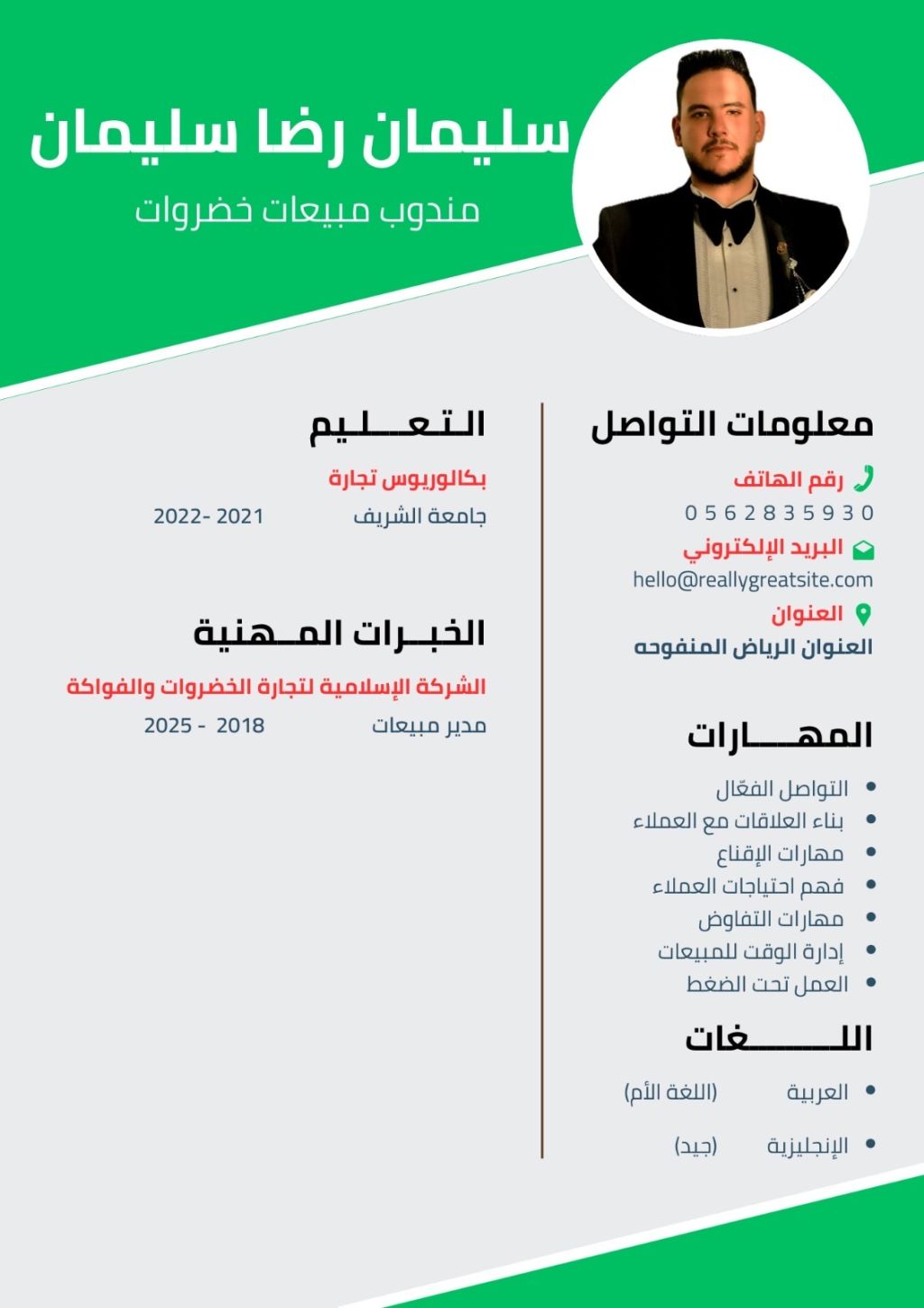 خبرة في مجال التجارة في الفاكه والخضروات خبرة 7 أعوام في المجال العمل لدى شركة الاسلاميه للفاكه والخضروات خبير في الحسابات والتجارة في مجال الفاكهة والخضروات العمر 27 سنة مصري الجنسية