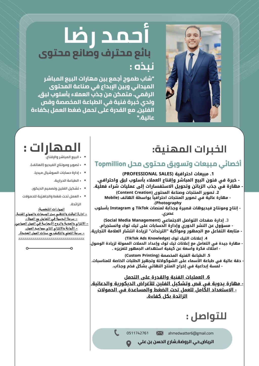 بائع وفني شوكولاته (شامل) مع مهارة التسويق الممول ابحث عن عمل كبائع ومسوق شوكولاته بخبرة فنية وتجارية فني طباعة على الشوكولاته + تقطيع وتنسيق فلين للهدايا. بائع لباقة في التعامل مع الزبائن وإدارة المبيعات. تسويق الكتروني القدرة على اطلاق اعلانات ممولة بسيطة لزيادة زوار المحل والطلبات. موظف واحد لادارة المحل، التجهيز الفني، وجذب الزبائن "للتواصل