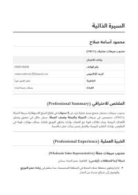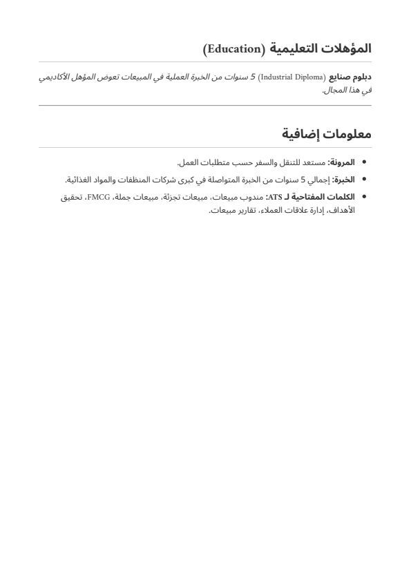 مندوب مبيعات خبرة أكثر من 5 سنوات في مجال المنظفات والمواد الغذائية وأجيد العمل تحت ضغط وتحقيق الأهداف المطلوبه والتعاون مع فريق العمل