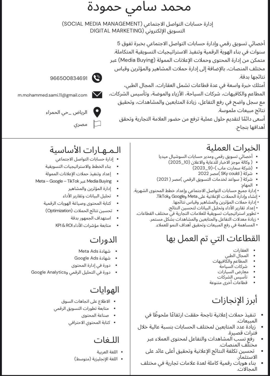 مسؤول إدارة حسابات التواصل الاجتماعي والتسويق الرقمي، متخصص في إدارة وتنمية الحسابات على مختلف منصات التواصل الاجتماعي، وبناء استراتيجيات تسويقية فعالة تعزز حضور العلامة التجارية وتزيد من التفاعل. امتلك خبرة في التسويق عبر المشاهير والمؤثرين، وإدارة الاعلانات الممولة وتحسين أدائها لتحقيق أفضل النتائج. أجيد تحليل البيانات وقراءة مؤشرات الأداء وقياس اثر الحملات التسويقية