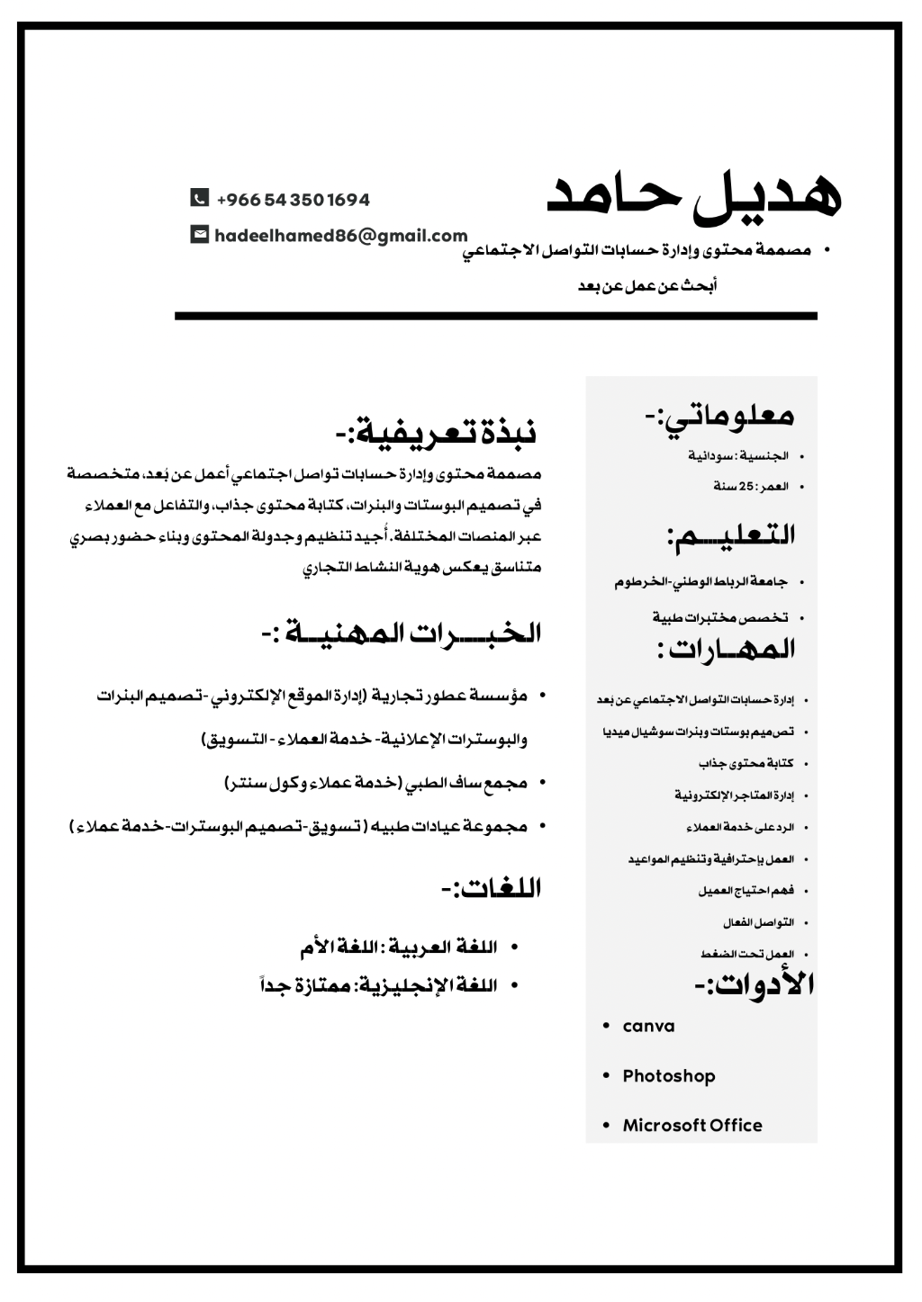 مصممة محتوى وإدارة حسابات سوشيال ميديا عن بعد، متخصصة في تصميم البوستات والبنرات، كتابة المحتوى، والتفاعل مع العملاء باحترافية