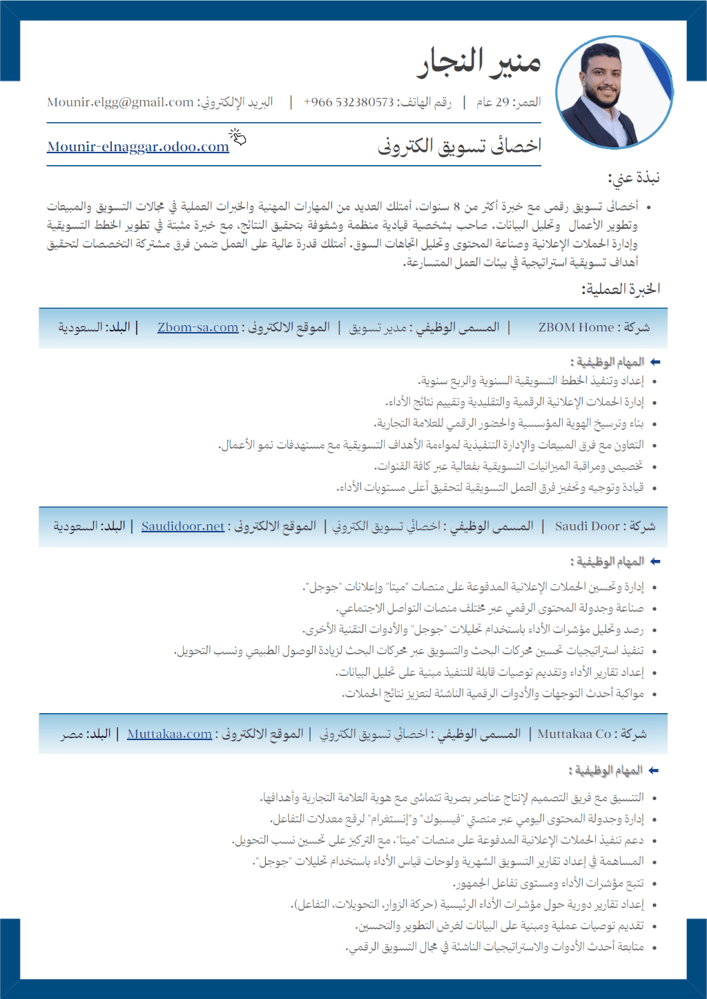 أخصائي تسويق رقمي مع خبرة أكثر من 8 سنوات، امتلك العديد من المهارات المهنية والخبرات العملية في مجالات التسويق والمبيعات وتطوير الأعمال وتحليل البيانات. صاحب بشخصية قيادية منظمة وشغوفة بتحقيق النتائج، مع خبرة مثبتة في تطوير الخطط التسويقية وإدارة الحملات الاعلانية وصناعة المحتوى وتحليل اتجاهات السوق. امتلك قدرة عالية على العمل ضمن فرق مشتركة التخصصات لتحقيق أهداف تسويقية استراتيجية في بيئات العمل المتسارعة