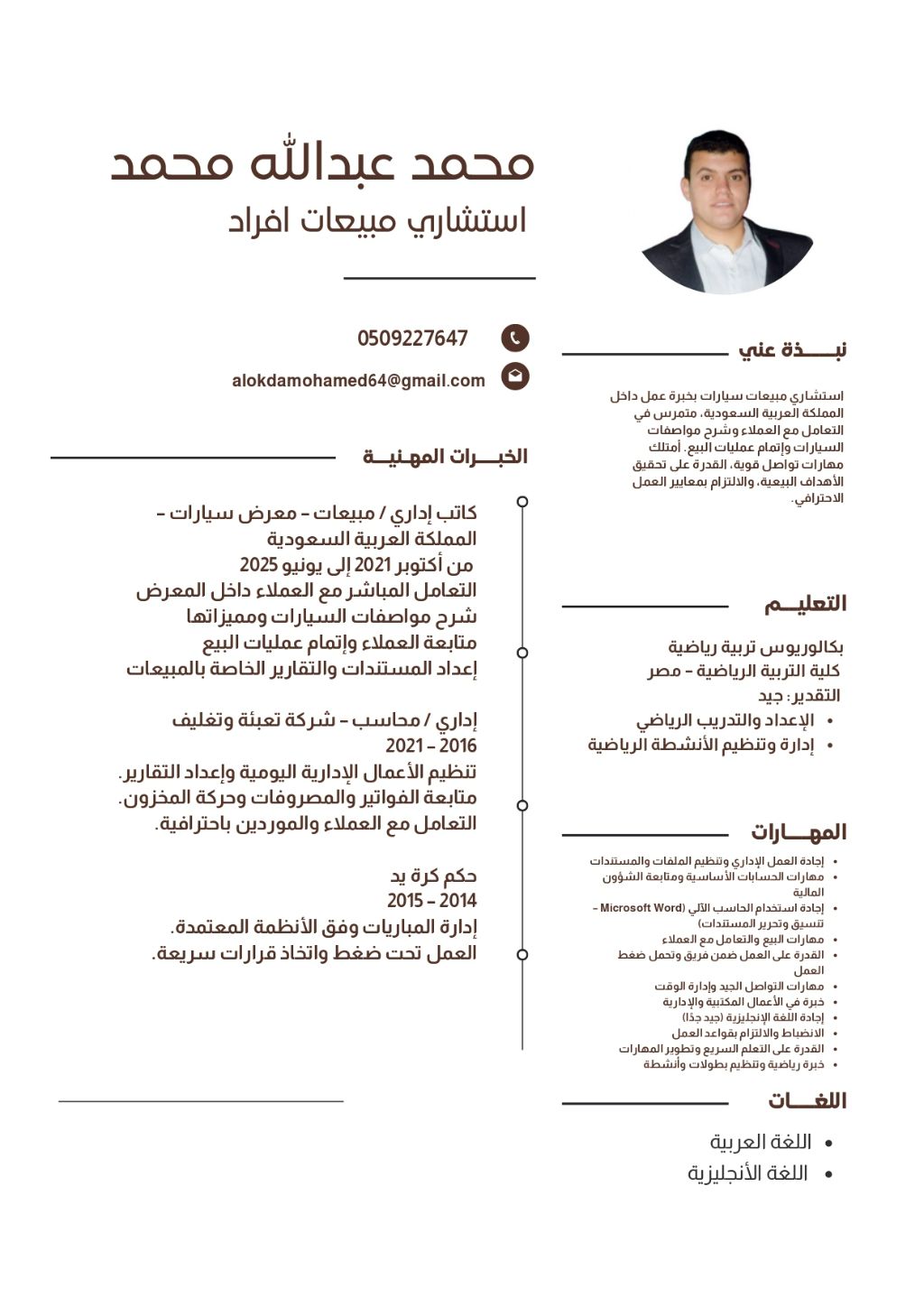 استشاري مبيعات سيارات بخبرة عمل داخل المملكة العربية السعودية، متمرس في التعامل مع العملاء وشرح مواصفات السيارات واتمام عمليات البيع. امتلك مهارات تواصل قوية، القدرة على تحقيق الأهداف البيعية، والالتزام بمعايير العمل الاحترافي. الاسم محمد عبد الله محمد العقدة. للتواصل