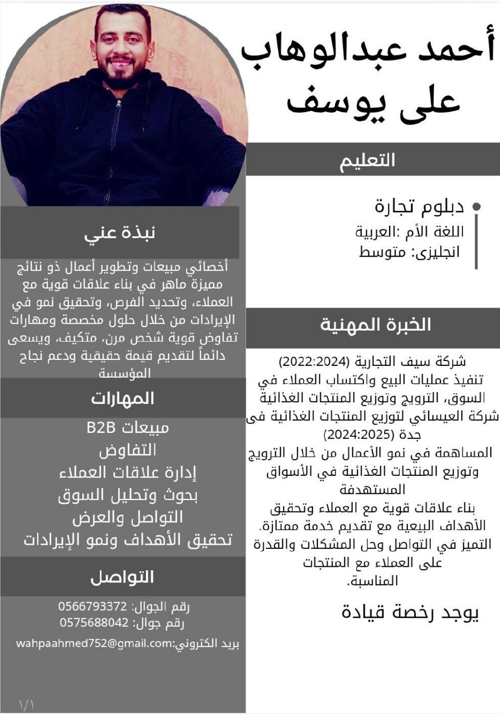 الاسم أحمد عبد الوهاب علي يوسف. السن 28. عام. ابحث عن عمل في مجال المبيعات. أو أي شيء يوجد رخصة قيادة وإقامة سارية