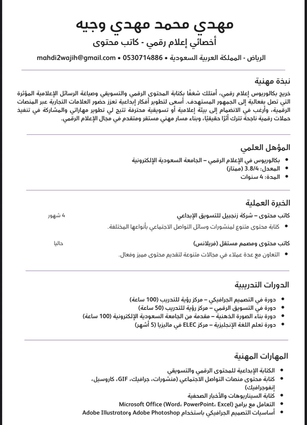 باحث عن وظيفة - اعلام رقمي باحث عن وظيفة، يمني مواليد المملكة، خريج اعلام رقمي، ابحث عن فرصة عمل مناسبة أستطيع من خلالها تطوير مهاراتي والمساهمة بشكل فعال. لدي مهارات في كتابة المحتوى التسويقي والاعلاني، وأساسيات في الفوتوشوب والاليستريتور، اضافة الى لغة انجليزية جيدة للتواصل. أستطيع العمل في كتابة محتوى واعلانات - تنسيق وإدارة محتوى السوشيال ميديا - كتابة وصف منتجات - المساعدة في الأعمال الاعلامية