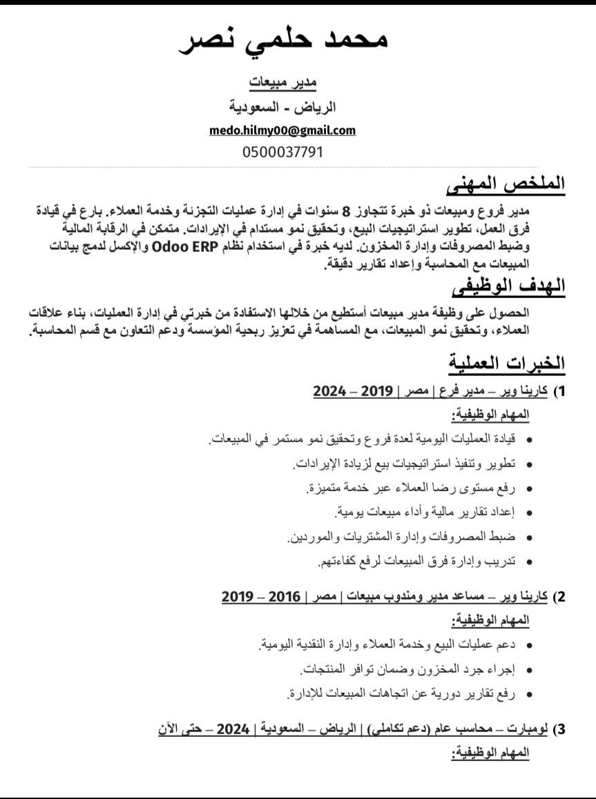 خبرة عملية تمتد ل 8 سنوات في المبيعات وادارة الفروع منها 5 سنوات في إدارة المبيعات والمعارض لشركات كبرى. متخصص في تحقيق الأهداف المالية وزيادة الايرادات - إدارة وتطوير فرق العمل - تشغيل وتنظيم المعارض باحترافية - تحسين الأداء ورفع معدلات النمو بالاضافة الى سنتين خبرة في المالية والمحاسبة، مما يمنحني قدرة قوية على قراءة الأرقام وتحليل الربحية واتخاذ قرارات مبنية على بيان