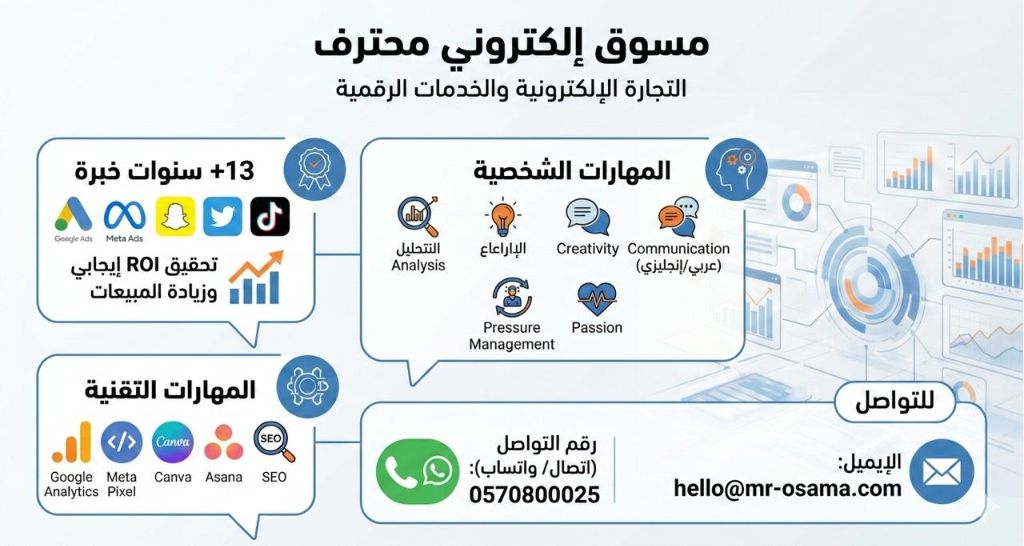 متخصص في التسويق الالكتروني والتسويق بالعمولة، امتلك شغفا حقيقيا بفهم سلوك العملاء وبناء استراتيجيات تسويقية فعالة تحقق نتائج ملموسة. أسعى للانضمام الى فريق عمل يقدر الابداع والابتكار في المجال الرقمي، وأطمح للمساهمة في تحقيق أهداف النمو والوصول للجمهور المستهدف بكفاءة عالية