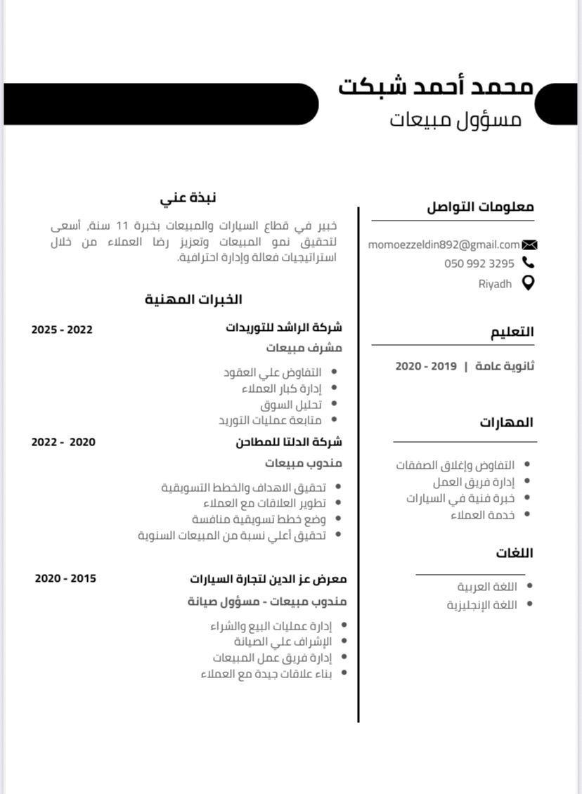 ابحث عن عمل في مجال مبيعات السيارات خبرة أكثر من 10 سنين ومبيعات المواد الغذائية خبرة 2 سنتين