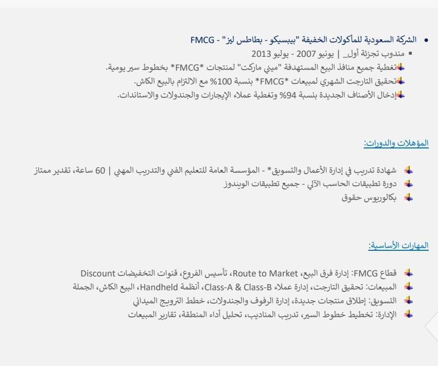 أنا ابحث عن عمل اشراف أو ادارة مبيعات لدي الخبر الكافيه عملت 17 سنة مبيعات وقطاع FMCG ولدي جميع عملا الأسواق والتخفيضات في الرياض شامل