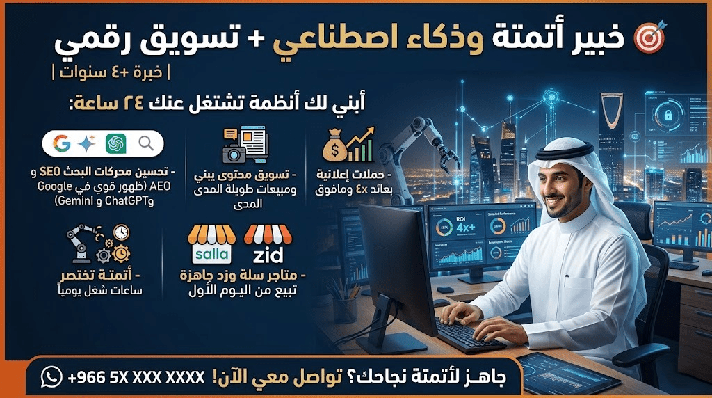 خبير اتمتة وذكاء اصطناعي + تسويق رقمي خبرة + 4 سنوات ابني لك أنظمة تشتغل عنك 24 ساعة تحسين محركات البحث SEO وAEO (ظهور قوي في Google وChatGPT وGemini) تسويق محتوى يبني ثقة ومبيعات طويلة المدى - حملات اعلانية بعائد 4x وما فوق - متاجر سلة وزد جاهزة تبيع من اليوم الأول - اتمتة تختصر ساعات شغل يوميا المقابلة شخصية في الرياض