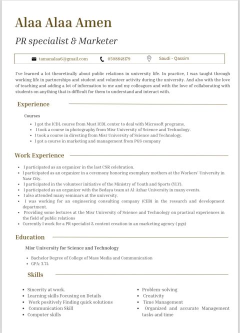 باحث عن وظيفة - تسويق الكتروني الرياض ابحث عن فرصة عمل في مجال التسويق الالكتروني داخل مدينة الرياض. لدي خبرة قوية في إدارة الحملات الاعلانية منخفضة التكلفة وعالية النتائج، مع تحقيق ملايين المشاهدات والوصول الدقيق للفئة المستهدفة. أتميز بمهارات التحليل والابداع وصناعة المحتوى، اضافة الى خبرة في وكالات التسويق والمبيعات. الرياض - حي الملك فهد