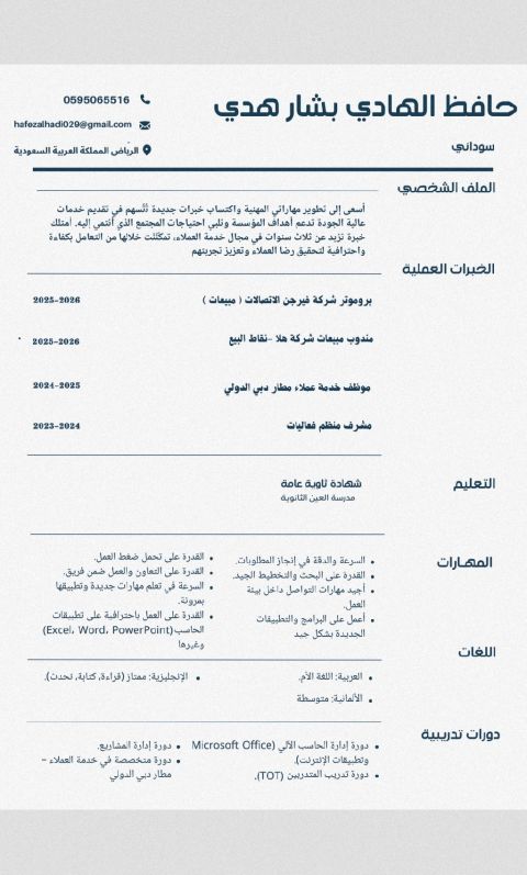 امتلك خبرة في مجال المبيعات وخدمة العملاء أكثر من 3 سنين كما انني أتحدث اللغة الانجليزية بطلاقة، بجانب اللغة العربية