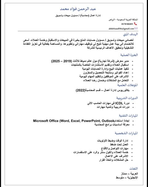 الاسم أسامة علي حامد خبرة أكثر من سنة في ادارة المخزون وتجهيز الطلبات، فولفمنت ولا ست مايل ابحث عن فرصة عمل في بيئة تحفز على التطور والنمو. أتميز بالالتزام، سرعة التعلم والعمل بروح الفريق يسعدني التواصل مع أي جهة ترى أن مؤهلاتي مناسبة مشرف عمليات لوجستيه تشمل إدارة العمال المخزون، تسليم مسارات مناديب التوصيل التواصل مع فريق العمل