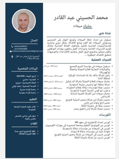 اسمي نشأت سمير أبو زيد سوداني الجنسية مندوب ومشرف مبيعات حاصل على بكالوريوس الشرف في ادارة الأعمال والتسويق خبرة 13 سنة في مجال المبيعات عملت في مجال المواد الغذائية والأجبان 8 سنة وفي مجال الدواجن المبرد والمجمد 3 سنوات عملت في جدة والمدينة المنورة والقصيم ولدي قاعدة عملاء كبيرة