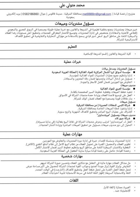 الاسم محمد حزام الجنسية اليمن العمر 45 سنة خبرة في مجال المبيعات فترة تجاوزت 25 سنة منها 10 سنوات في السوق السعودي عملت سابقا مسؤول فرع فوق 5 سنوات في مجال الانارة (LED) ومجالات وأنشطة أخرى في المبيعات عملت أيضا في مجال المشتريات أنشطة المقاولات والنقل المباشر المشتقات النفطية اشراف مباشر على عمليات الشراء والمتابعة أيضا عملت مساعد مدير ومشرف في مجال أنشطة المطاعم اشراف كامل تشغيل ضمن معايير السلامة