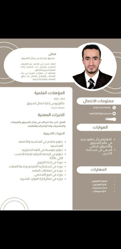 فضل يحيى - 28 سنة - بكالوريوس إدارة أعمال / تسويق 2025، خبرة مبيعات وتسويق لأكثر من 9 سنوات - لدى عدة شركات وأنشطة مختلفة - الكترونيات - مواد غذائية - صحية - وكذلك أعمال ادارية - محاسب - كاشير - مخازن - اشراف ومتابعة - مندوب مبيعات وتوزيع. امتلك مهارات مختلفة حاسوب، انجليزي، قيادة رافعة + جرافة + تريله - خبرة بسيطة في الأعمال الانشائية - لكن المبيعات والتسويق هي قلب مهاراتي وشغفي بكل مسؤولية وثقة