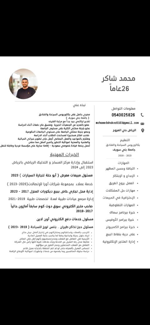 ابحث عن عمل مصري 27 سنة غير مدخن مقيم في الرياض حي المروج حاصل على بكالوريوس السياحة والفنادق مبيعات أو إدارة أو استقبال اقامة قابلة للتحويل أحمل رخصة قيادة سعودية خبرة بالاستقبال والإدارة والمبيعات خبرة ببرنامج سماك المحاسبي وبرامج الأوفيس والكمبيوتر وادخال البيانات وإدارة المتاجر الالكترونية وخدمة العملاء وامتلك مهارات تفاوض عالية لاتمام صفقات البيع ومهارات حل المشكلات