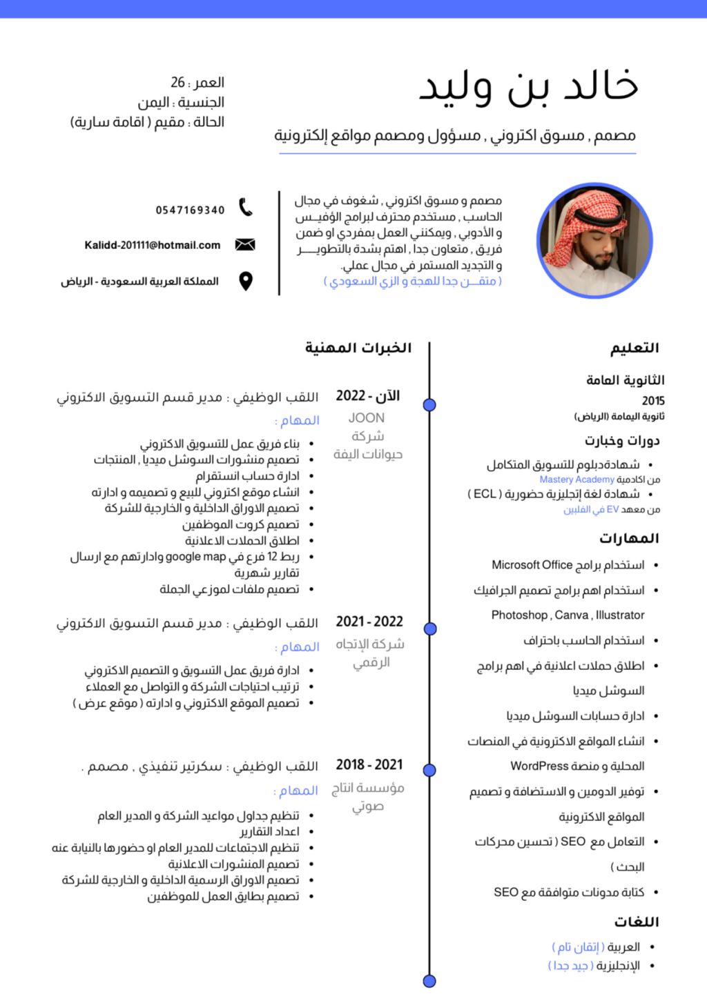 مصمم ومسوق الكتروني متقن لبرامج الأوفيس متقن للفوتوشوب مدير سوشيال ميديا مدير ومصمم مواقع الكترونية على المنصات المحلية، أتحدث الانجليزية بشكل مقبول) العمر 27 الجنسية يمني مواليد السعودية الحالة مقيم (إقامة سارية) متقن جدا للهجة السعودية والزي السعودي