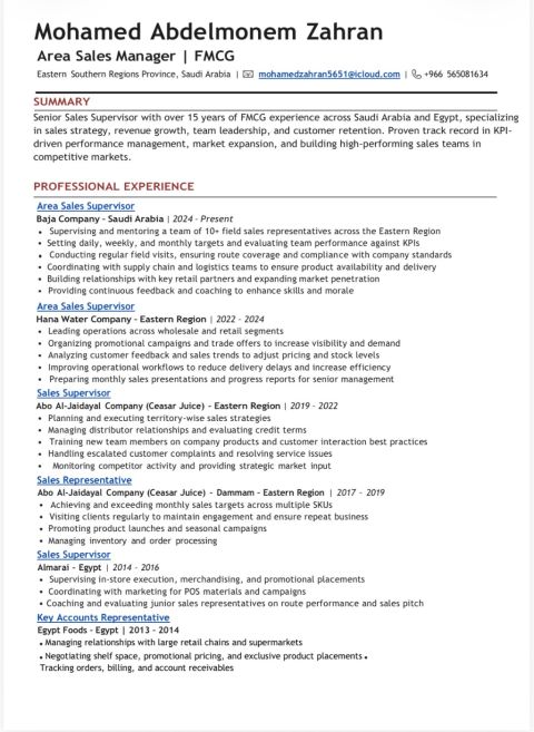 مدير مبيعات محترف خبرة أكثر من 20 عاما في السوق السعودي في قيادة كبري المؤسسات والشركات السعودية وإدارة المبيعات والمندوبين والقدرة التامة باحترافية علي تحقيق الأهداف في مجال العطور والمعطرات والتجميل والعناية والكماليات والسيشوارات والمنظفات والبلاستيكات. وغيرها جاهز للعمل فورا وفي أي منطقة بالمملكة / الإقامة الحالية / الرياض