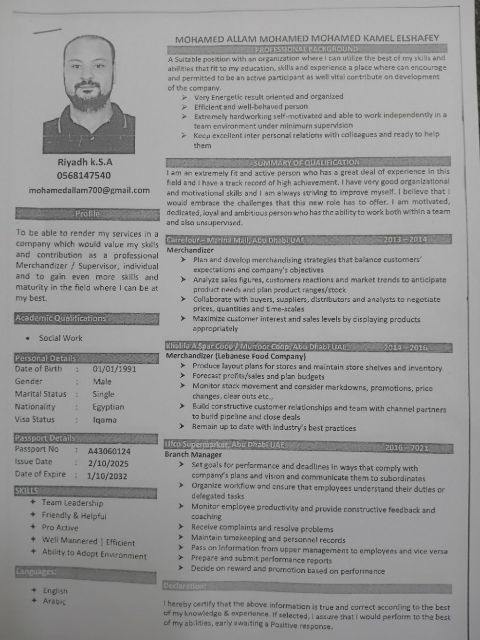الاسم/ محمد علام محمد) حاصل على بكالوريوس خدمة اجتماعيه (مصري) العمر 35) إقامة سنة) خبرة في مبيعات التجزئة والمواد الغذائية خبرة 7 سنين بالعمل في شركة الفواكه اللبنانيه في الامارات العربية المتحدة (lifco) وأتحدث اللغة الانجليزية وخبرة في تجهيز الأوردرات مع السرعة في التنفيذ بدون أخطاء والمتابعة وأيضا استلام المنتجات من الشركات وتقفيل كونترات الكاش وعمل التقرير اليومي ومتابعة مخزن السوبر ماركت