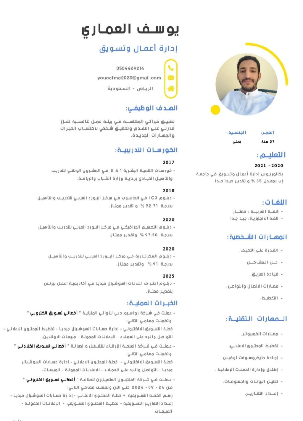 أخصائي تسويق الكتروني لدي خبرة عملية في وضع خطط التسويق الالكتروني - إدارة الحملات الاعلانية الممولة (Tiktok Ads - Meta Ads - Snapchat ads - Google ads) رفع المبيعات والتعامل مع العملاء. تخطيط المحتوى التسويقي. تحليل الأداء وصياغة استراتيجيات تسويق رقمية ناجحة. خريج بكالوريوس إدارة أعمال وتسويق بتقدير جيد جدا، وأسعى لتوظيف خبراتي ومهاراتي في تطوير العلامة التجارية وتحقيق نتائج ملموسة
