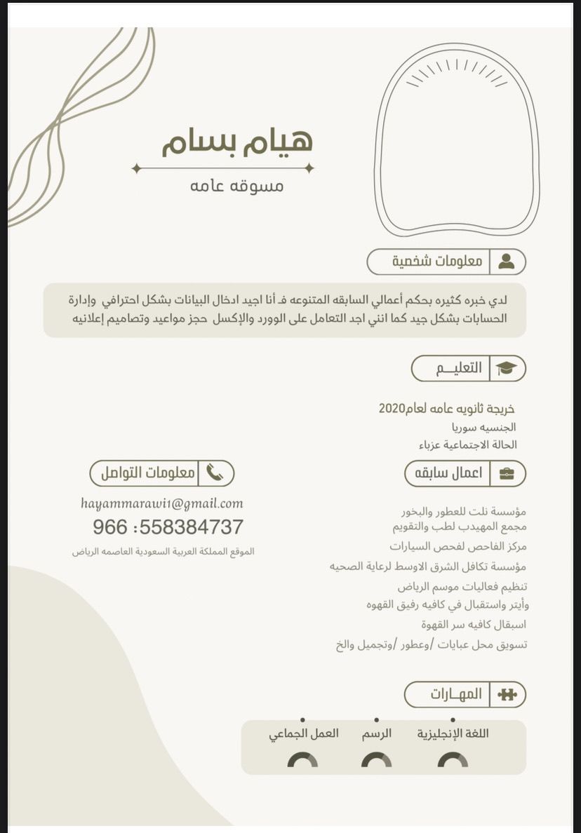 ابحث عن عمل وهاد السي في تبعي الجنسية سوريه العمر 21 مواليد الرياض مكان السكن النسيم الغربي