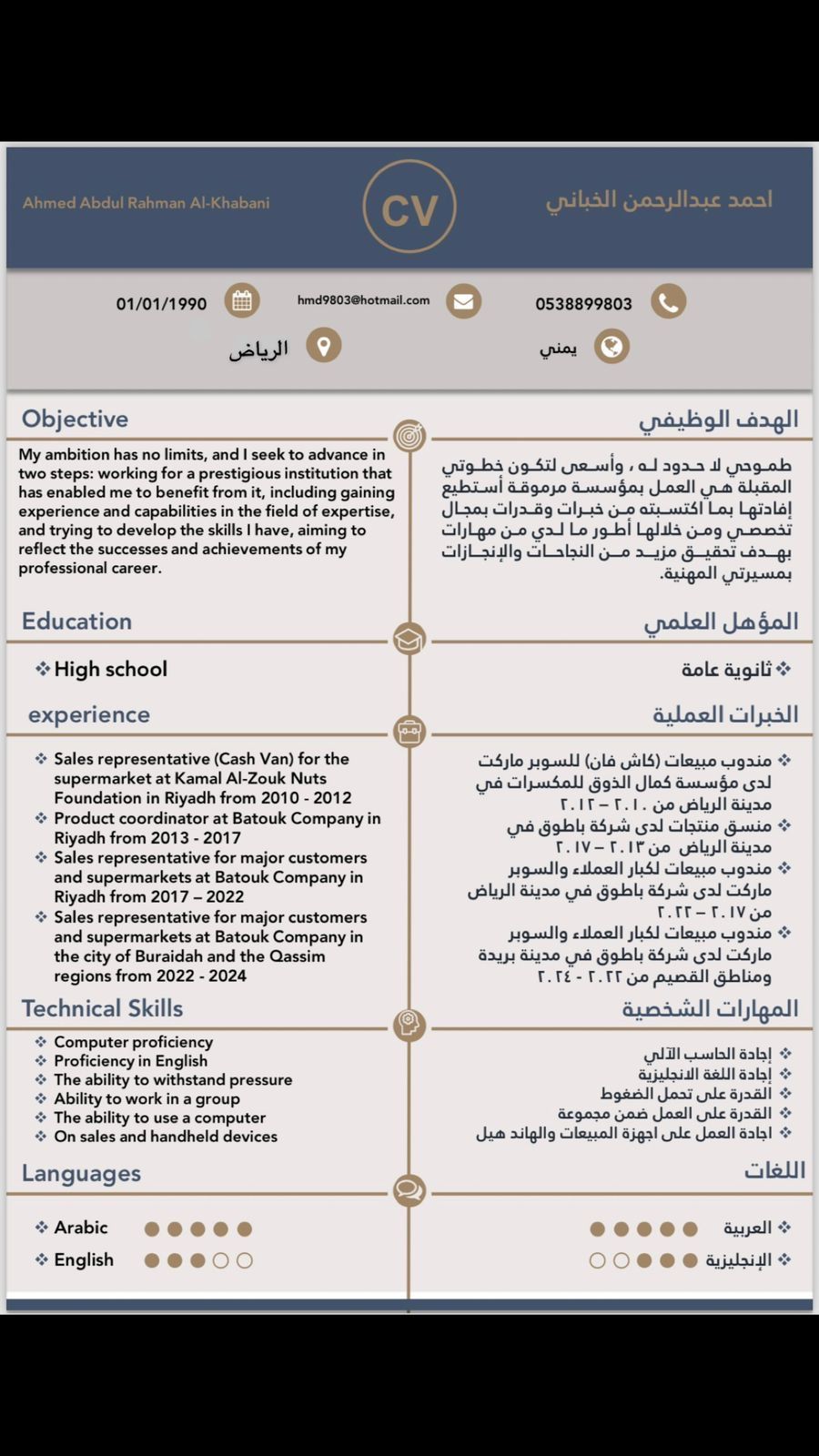 Field sales and marketing representative with long experience in the field of sales Experience in the city of Riyadh and the Al Qassim region I worked in the field of food and sweets and I do not mind changing the activity I do not find it difficult to achieve sales goals and attract new customers Transferable residence and a valid driver's license