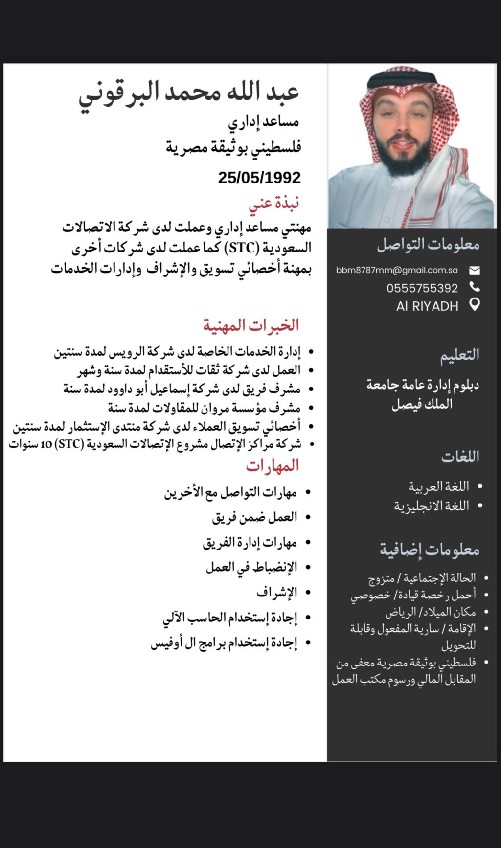 ابحث عن وظيفة دائمه وعمل في تطوير وبيئة عمل متطوره وأمان وظيفي وأشارك بتطوير المنشأة بخبرتي والعملية وجهدي وانضم لعائلة جديدة أثبت فيها قدراتي + يتوفر عندي سكن وسيارة ومواليد السعودية وأحمل وثيقة فلسطيني وثيقة مصرية ومعفى من رسوم مكتب العمل ومرفق لكم أل CV جميع الخبرات