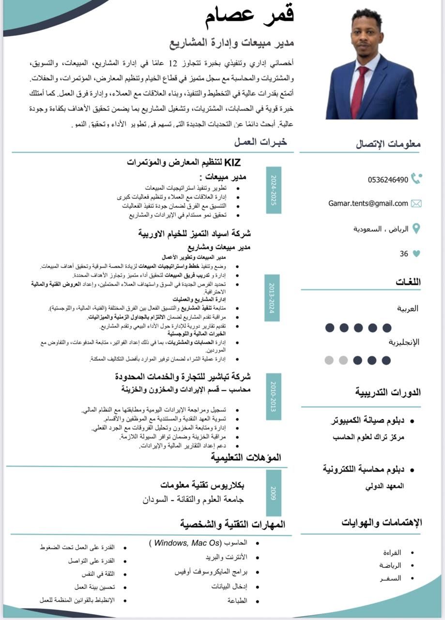 خبرة أكثر من 12 سنة في الرياض سوداني الجنسية احترافي في مجال التسويق والمبيعات وخدمة العملاء وادارة المشاريع في مجال الخيام وتنظيم المعارض والمؤتمرات والحفلات وخبرة في مجال الحسابات والمشتريات وادارة التشغيل بالمواقع