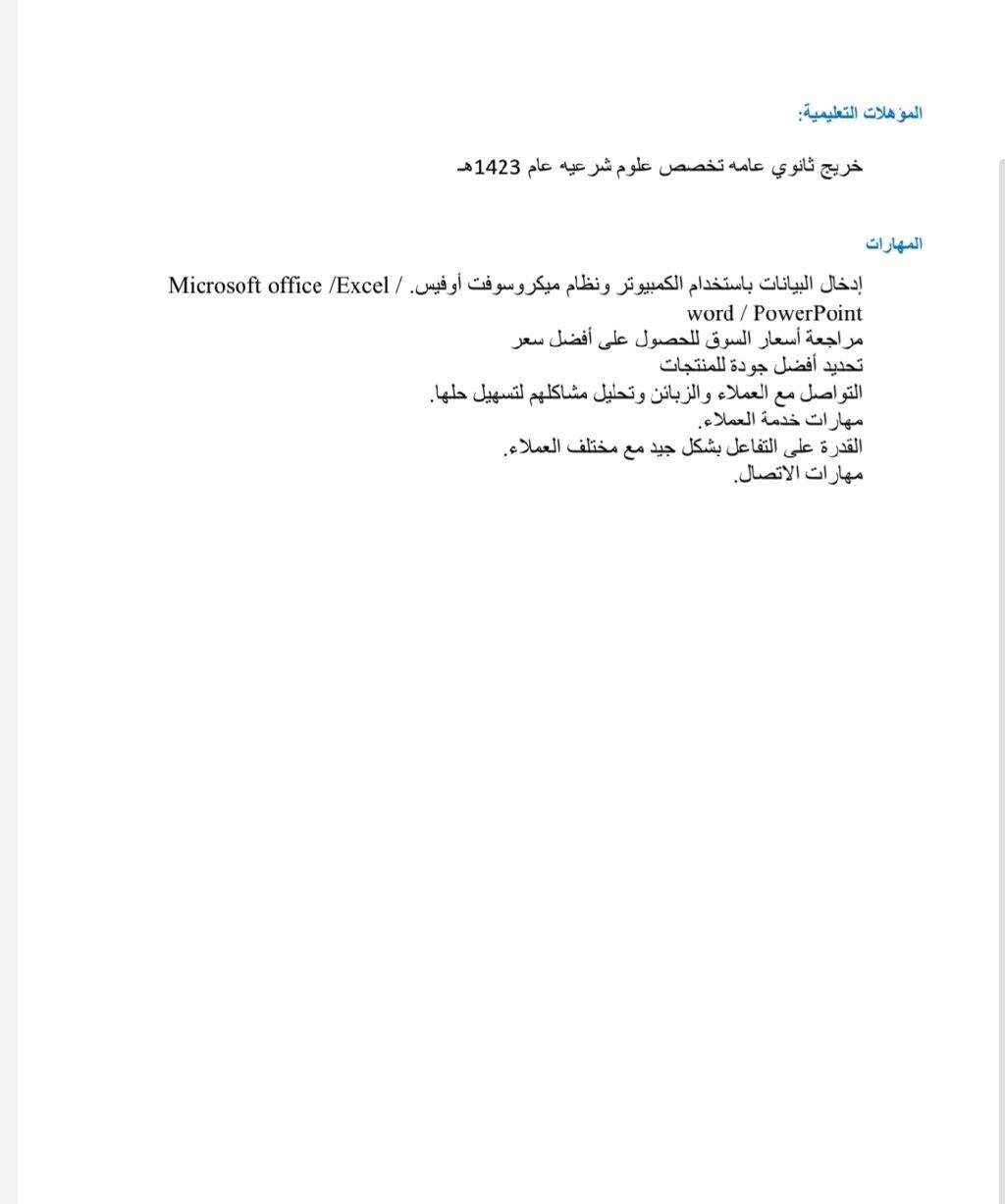 يمني الجنسية لدي اقامة ورخصة قيادة عندي خبرات لأكثر من 10 سنوات في مجال المبيعات والمشتريات والاشراف، خبراتي مندوب مشتريات ومندوب مبيعات وكمان مشرف في السعودية لأكثر من 10 سنوات ولدي مهارات التفاوض مع الموردين، التواصل الفعال، التخطيط والتنظيم، تحليل عروض الأسعار، بناء العلاقات وحل المشكلات وغيرها من المهارات أرغب في الحصول على فرصة في مجالي ومتفرغ للعمل، فالكم التوفيق