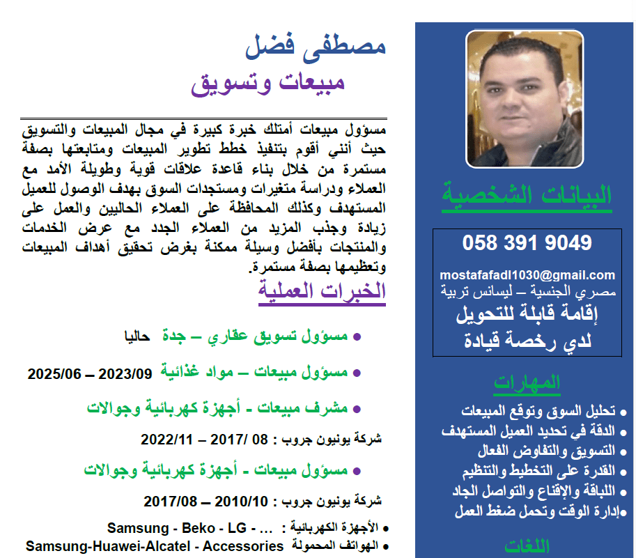 مسؤول مبيعات امتلك خبرة كبيرة في مجال المبيعات والتسويق حيث انني أقوم بتنفيذ خطط تطوير المبيعات ومتابعتها بصفة مستمرة من خلال بناء قاعدة علاقات قوية وطويلة الأمد مع العملاء ودراسة متغيرات ومستجدات السوق بهدف الوصول للعميل المستهدف وكذلك المحافظة على العملاء الحاليين والعمل على زيادة وجذب المزيد من العملاء الجدد مع عرض المنتجات والخدمات بأفضل وسيلة ممكنة بغرض تحقيق أهداف المبيعات وتعظيمها بصفة مستمرة