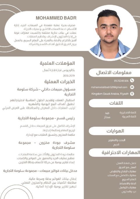 خبير مبيعات داخلي - خبرة 7 سنوات - مولات السلام عليكم، أنا محمد علي بدر، حاصل على بكالوريوس تجارة وإدارة أعمال، ولدي خبرة 7 سنوات في المبيعات الداخلية بالمولات. بدأت مسيرتي كمساعد بائع وتطورت الى مساعد مشرف، مما اكسبني خبرة واسعة في إدارة فرق المبيعات الداخلية وتحفيزهم لتحقيق أفضل النتائج التعامل مع العملاء بكفاءة وبناء علاقات طويلة الأمد متابعة المخزون وتنظيم عمليات البيع بشكل احترافي تحقيق