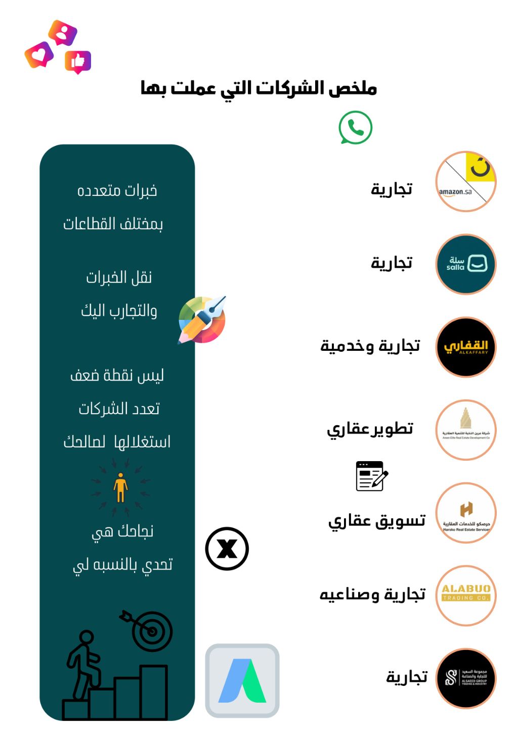 خبراتي متراكمة بالسوق السعودي لأكثر من 10 سنوات في مجال التسويق والمبيعات مهارات متعددة امتلكها تصميم وتصوير ومونتاج واطلاق حملات اعلانية بالاضافة والأهم ادارة المنصات الخاصه بالذكاء الاصطناعي وصنع برامج تتناسب مع الشركة مهما كان نشاطها بسهولة أسعى للحصول على فرصه وظيفيه بمجال المبيعات والتسويق سواء بالقطاع التجاري المختلف وادارة المتاجر الالكترونية أو القطاع العقاري وأي مجال آخر