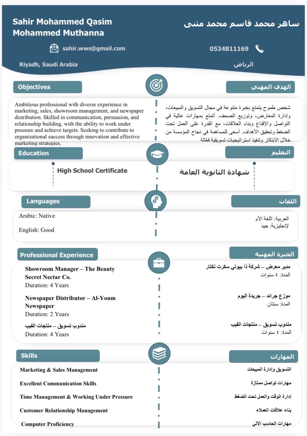 ابحث عن فرصة عمل في مجال التسويق والمبيعات. لدي خبرة تتجاوز 8 سنوات في إدارة المعارض، التسويق، وتوزيع الصحف. أتمتع بمهارات قوية في التواصل والاقناع، إدارة المبيعات، والعمل تحت الضغط. مستعد للانضمام فورا والمساهمة في نجاح