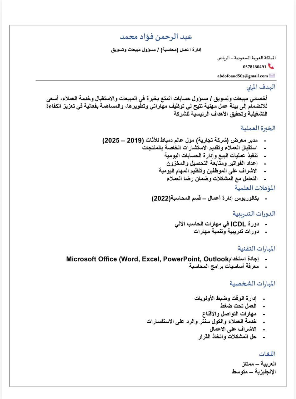 ابحث عن فرصة عمل خبرة بمجال التسويق والمبيعات عرض المنتجات وتقديم المقترحات وخدمة العملاء والكول سنتر الاستقبال إدارة حسابات السوشيال ميديا الحسابات اليوميه وادخال الفواتير استخدام الحاسب الآلي وبرامج الأوفيس