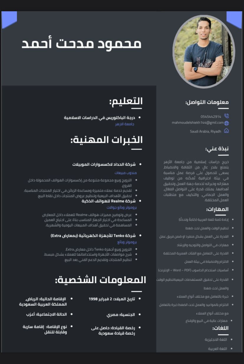 الاسم محمود مدحت أحمد / الجنسية مصري ابحث عن عمل. خبرة أكثر من ثلاث سنوات في مجال المبيعات، مندوب لدي شركة الحداد لأكسسوارات الجوال، بر محرك وبائع جوالات لدي شركة ريلمي للجولات، بر محرك وبائع لدي معارض اكسترا شركة تينكو للاجهزة الكهربائية. إقامة سارية وجاهزه للنقل ورخصة سارية. مؤهل دراسي عالي