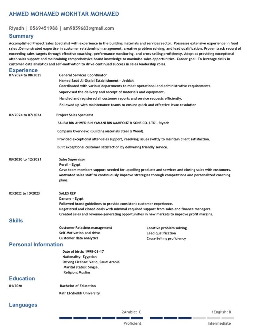 أنا أحمد مختار، ابحث عن فرصة عمل في الرياض في مجال المبيعات أو الاشراف الميداني. خبرة أكثر من 4 سنوات في المبيعات داخل شركات الأغذية ومواد البناء. أجيد بناء علاقات قوية مع العملاء وتحقيق الأهداف البيعية. حاصل على ليسانس تربية - جامعة كفر الشيخ (دفعة 2022) امتلك رخصة قيادة سعودية سارية واقامة قابلة للتحويل