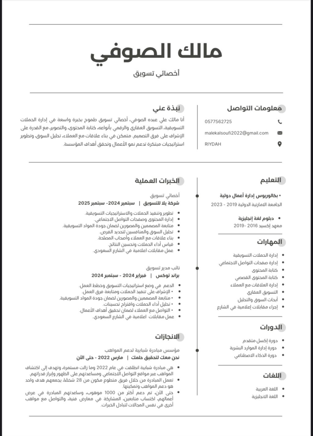 Marketing Specialist Experienced in managing social media accounts, creating content, coordinating with designers, and photography. Skilled in various aspects of digital marketing and seeking an opportunity to contribute to the growth and development of a brand