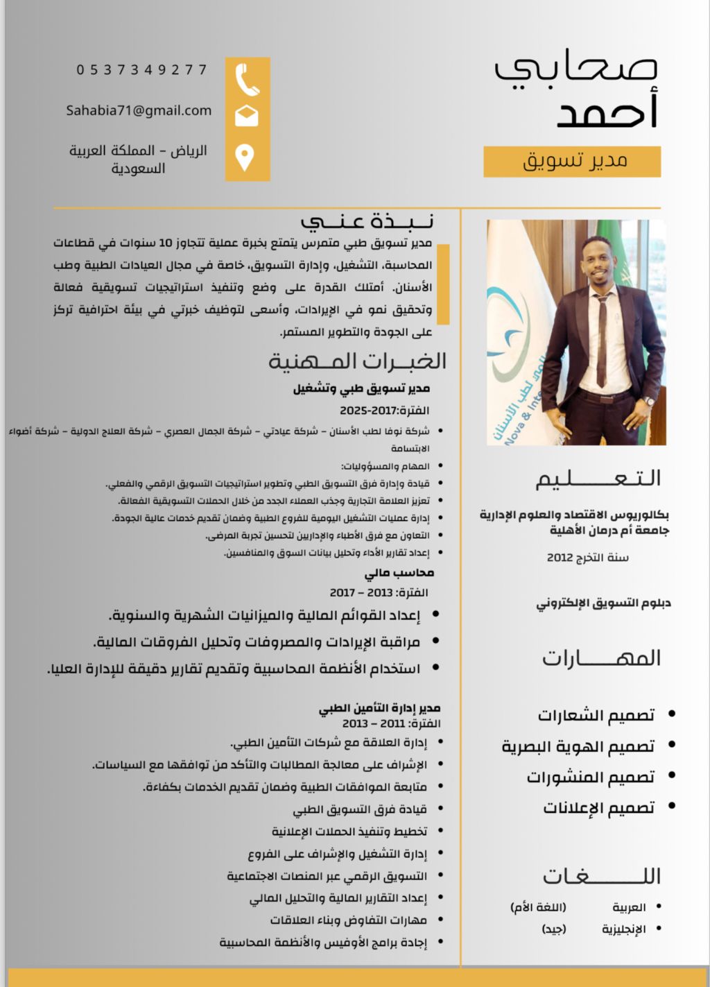الاسم صحابي أحمد أبو القاسم القرشي. رقم الهاتف 0537349277 العنوان الرياض - الهدف المهني مدير تسويق طبي متمرس يتمتع بخبرة عملية تتجاوز 10 سنوات في قطاعات المحاسبة، التشغيل، وإدارة التسويق، خاصة في مجال العيادات الطبية وطب الأسنان. امتلك القدرة على وضع وتنفيذ استراتيجيات تسويقية فعالة وتحقيق نمو في الايرادات، وأسعى لتوظيف خبرتي