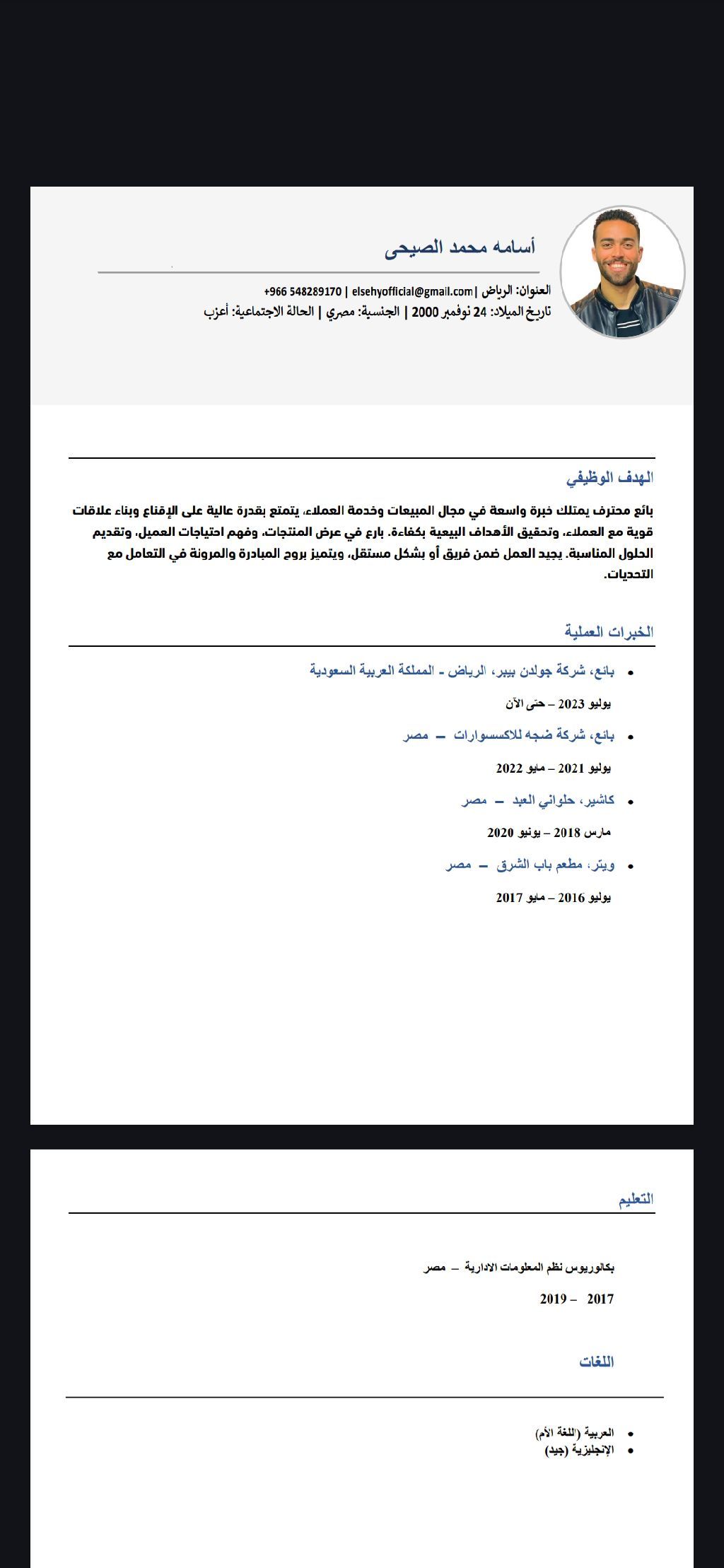 الاسم أسامة محمد مقيم في الرياض عندى خبرة كبيرة في مجال المبيعات خبرة في الكاشير